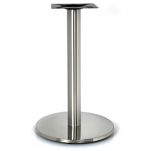 Подстолье из полированной нержавеющей стали (матовое). Диаметр основания: 45 см, диаметр трубы: 7,6 см. размер верхней площадки: 25х25 см. Рекомендуемый размер столешницы: D-70, 70х70
