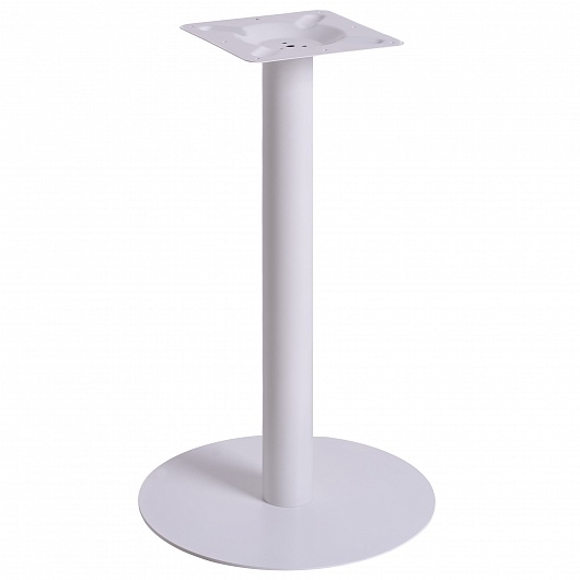 Подстолье металлическое. Труба и основание-белое порошковое покрытие. Основание плоское. Рекомендуемый размер столешницы: D-70, 70х70.