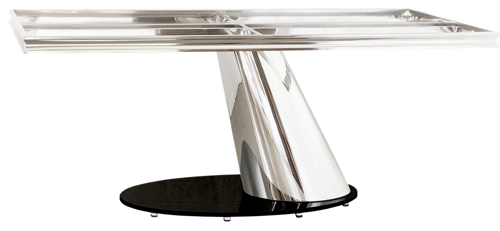 Подстолье из полированной нержавеющей (зеркальное) стали. В основании закаленное стекло толщиной 15 мм. Рама под столешницу размером 176х86.