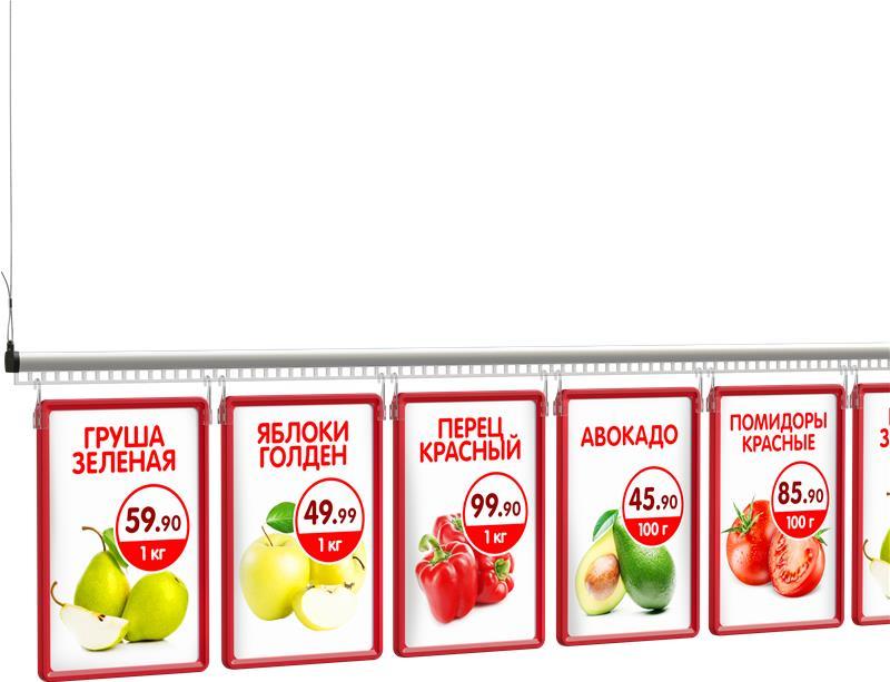 Подвешивайте в любом месте торгового зала ценники или рекламные постеры с помощью подвесной системы ECOTRACK-SET в пластиковых рамках форматов А5-А3 или пластиковых карманах PH с металлическими крючками.
