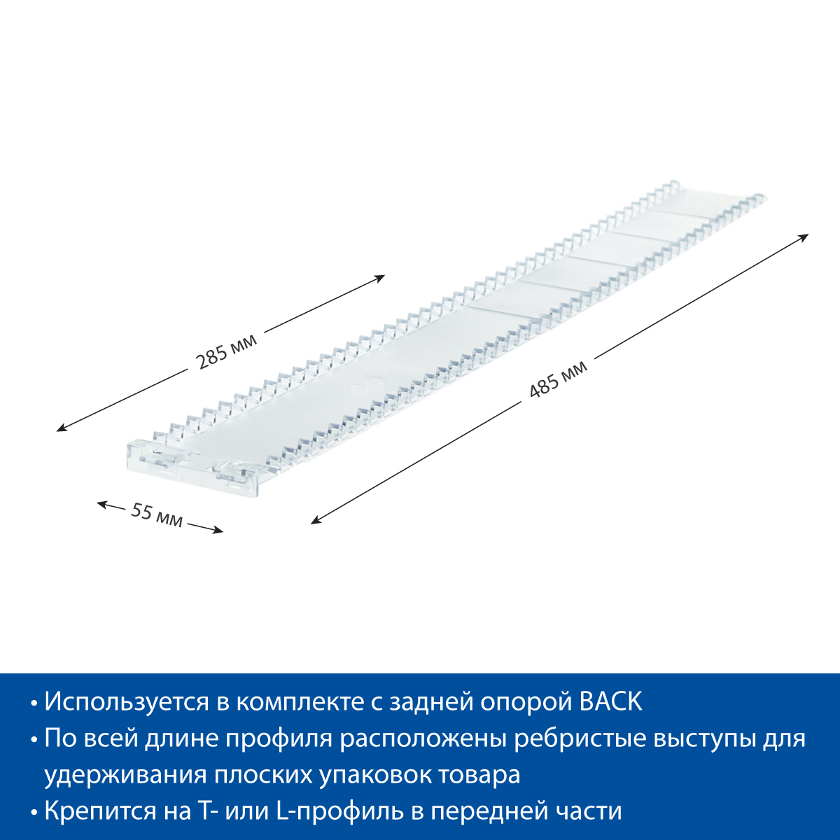 Ребристый профиль BACKLINE служит основой для установки задней опоры BACK. По всей длине профиля расположены ребристые выступы для дополнительного удерживания плоских упаковок товара в вертикальном положении.