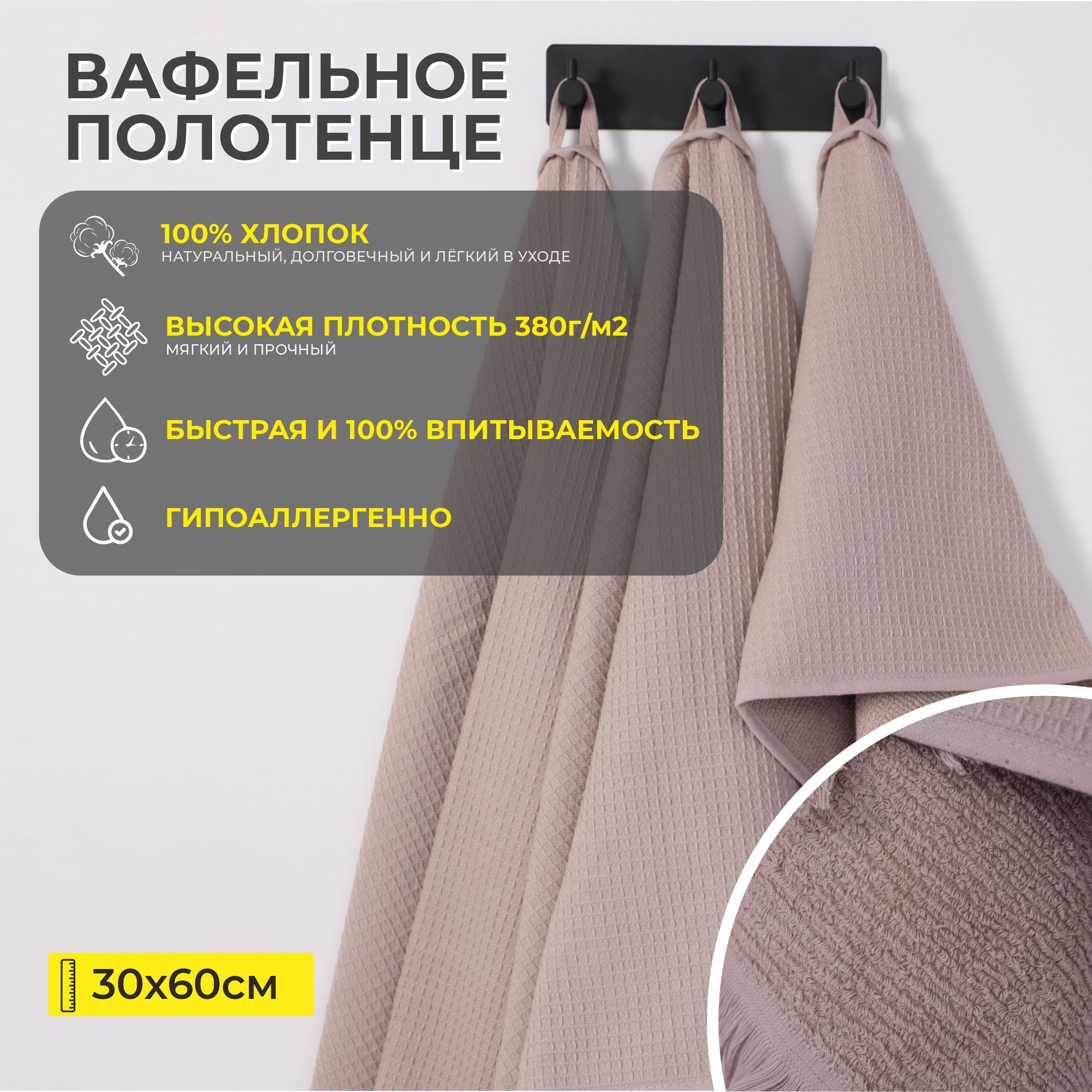 Наименование: Полотенце вафельное, 30*60см, пепельно-розовый