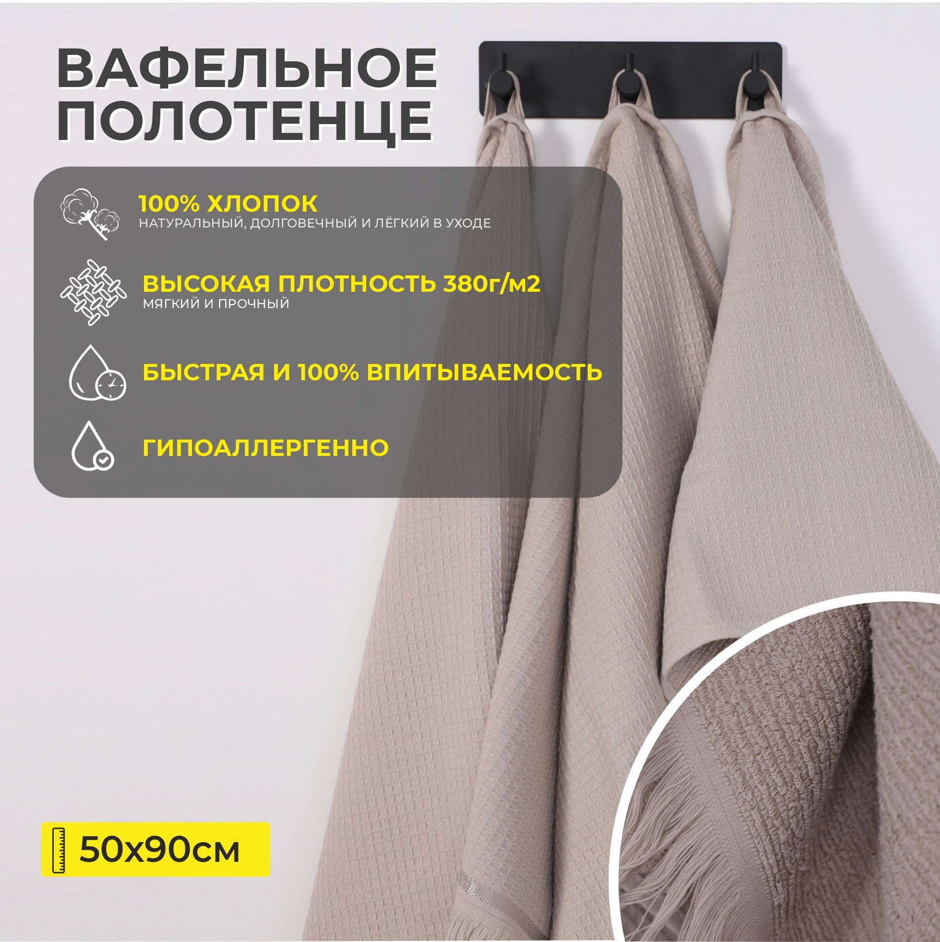 Полотенце вафельное, 50*90см, бежевый