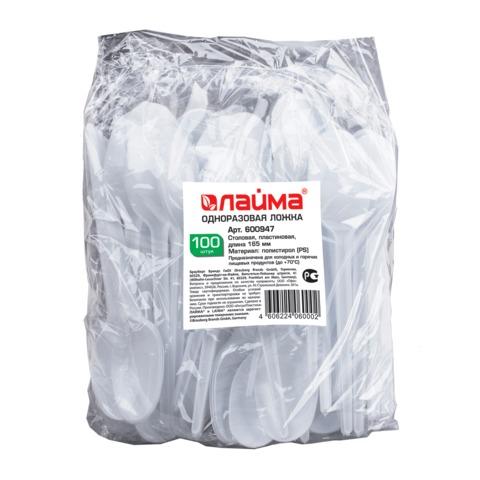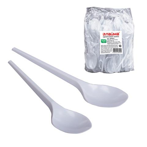 Одноразовые ложки столовые 165 мм, КОМПЛЕКТ 100 шт., "БЮДЖЕТ", пластиковые, белые, LAIMA, 600947