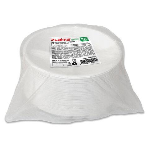 Одноразовые тарелки 3-х секционные КОМПЛЕКТ 100 шт. 220 мм, белые, ПП, холодное/горячее, LAIMA СТАНДАРТ, 608769