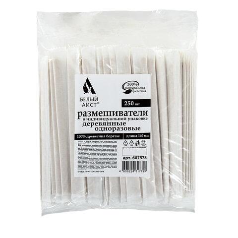 Размешиватель одноразовый деревянный в индивидуальной упаковке 140 мм, КОМПЛЕКТ 250 шт., БЕЛЫЙ АИСТ/WELDAY, 607578