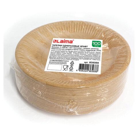 Тарелка одноразовая крафт бумажная 230 мм, КОМПЛЕКТ 100 штук, LAIMA ECO CRAFT, 608088