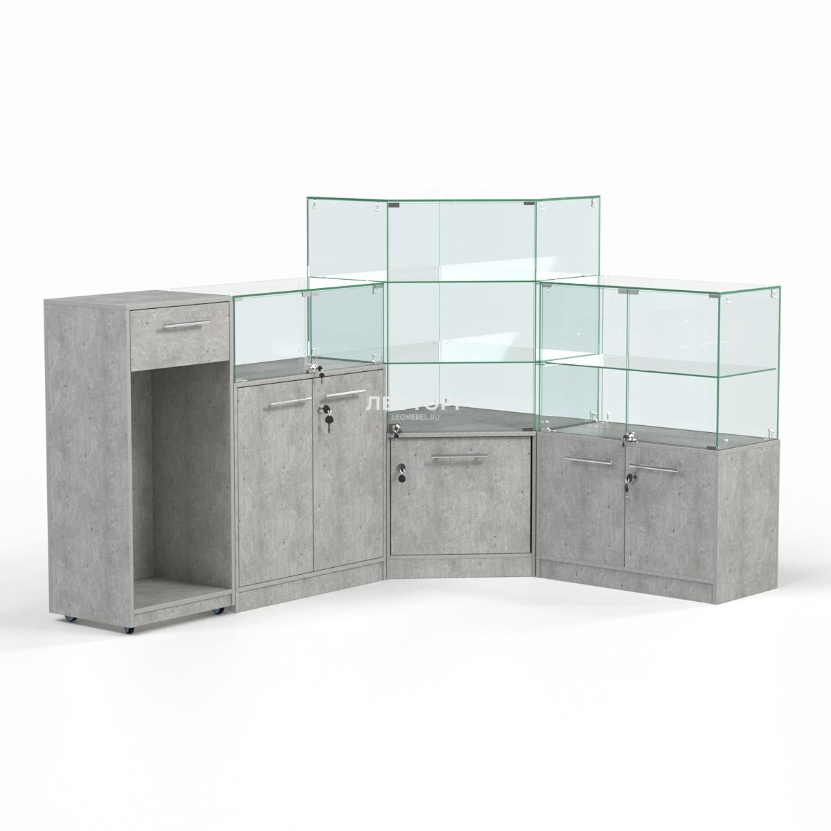 Комплект включает два прямоугольных прилавка, пятиугольный и закрытый прилавки.