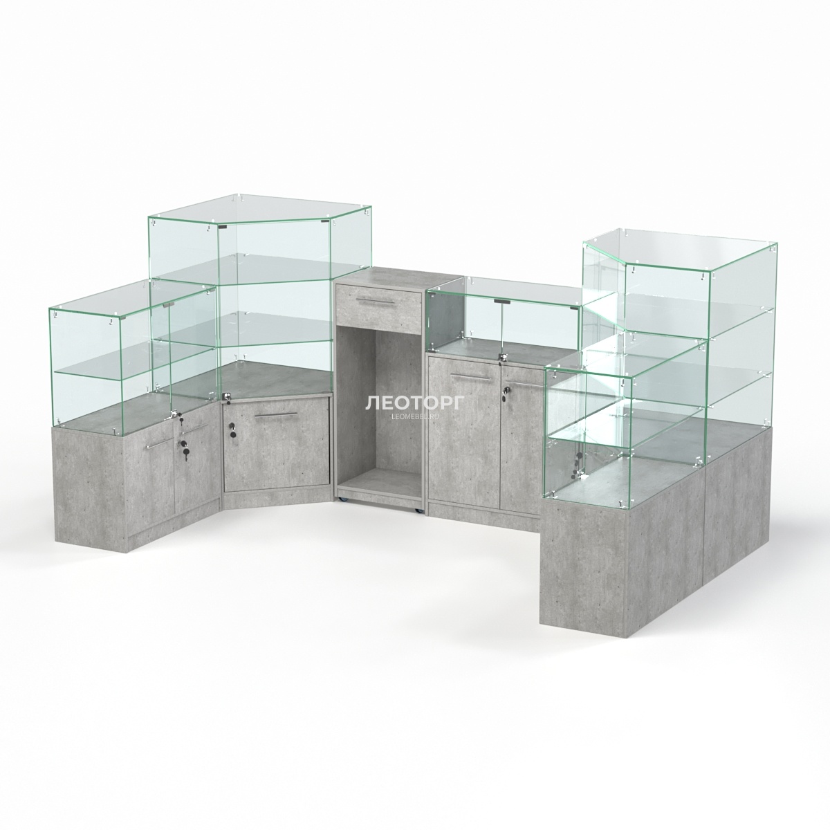 Комплект включает три прямоугольных прилавка, два пятиугольных и один закрытый прилавок.