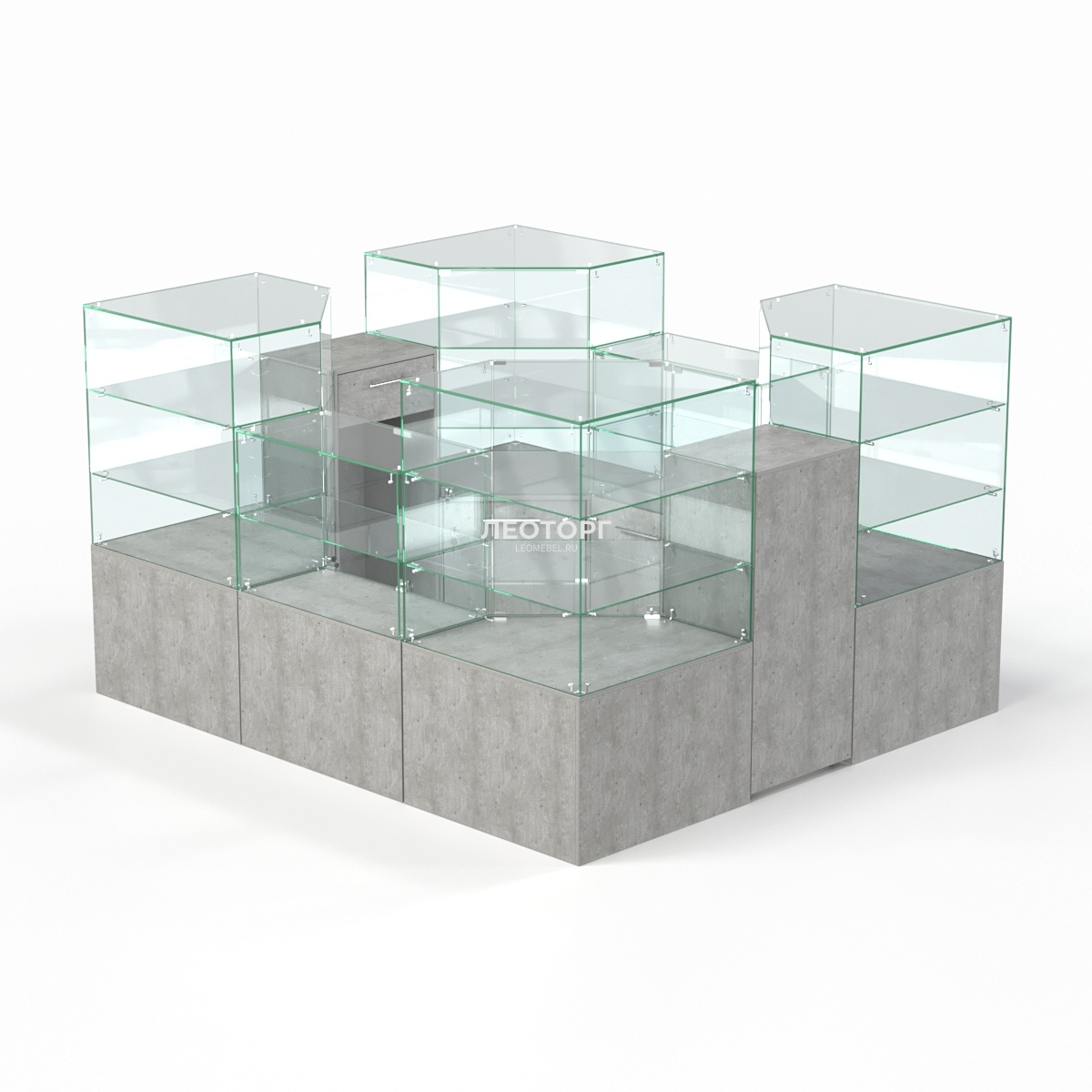 Комплект включает два прямоугольных прилавка, четыре пятиугольных и два закрытых прилавка.