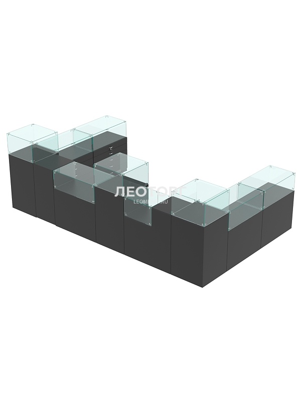 Комплект включает квадратные прилавки с витриной, прилавки с выдвижными ящиками, прилавок с дверцей и выкатной прилавок.
