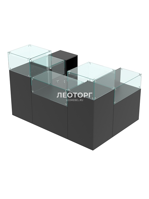 Комплект включает квадратные прилавки с витриной, прилавки с распашными дверцами, выкатной прилавок.