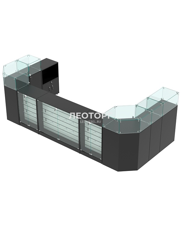 Комплект прилавков подойдет для выкладки кожгалантерейных изделий, а также дорогих аксессуаров.