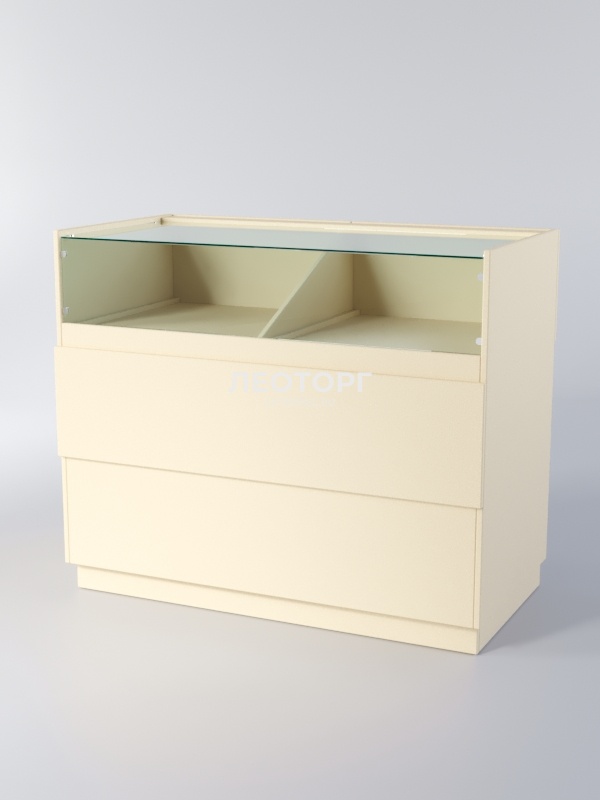 Прилавок состоит из двух отделений, оборудованных полками из ЛДСП. Крыша стеклянная. Передняя панель выполнена из ЛДСП.