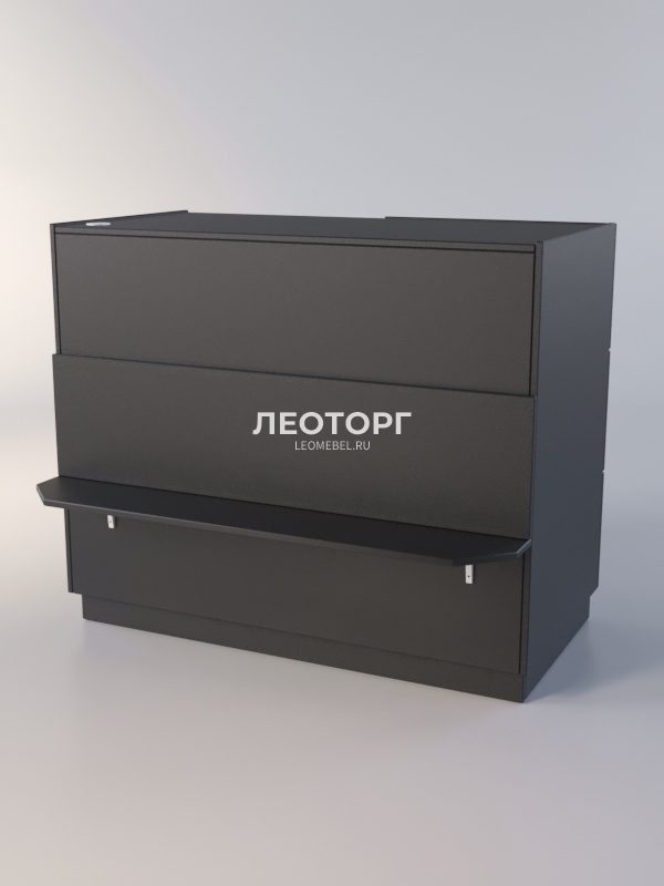 Закрытый прилавок. Передняя панель оборудована полкой для сумок. Внутренняя сторона состоит из двух отделений. В одном отделении находится три выдвижных ящика, в другом - полка.