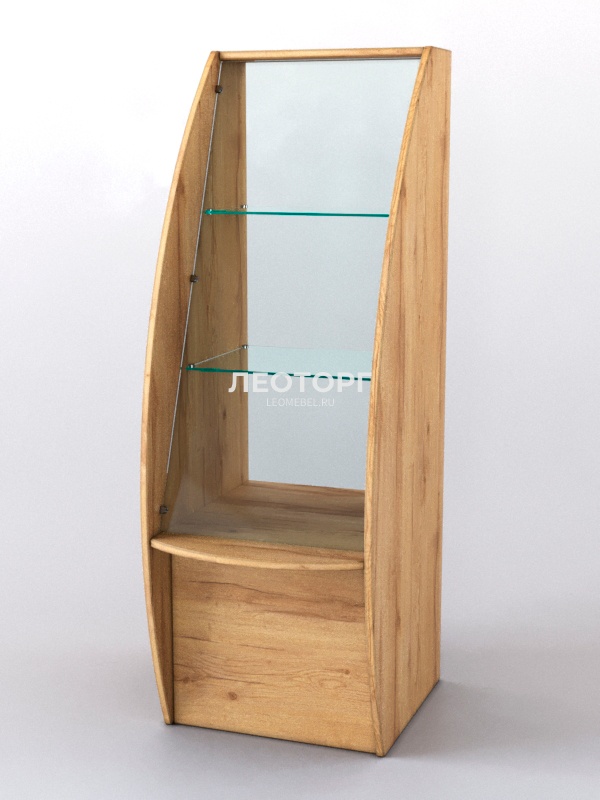 Конструкция содержит стеклянную витрину с двумя полками и накопитель. Витрина и накопитель открыты с внутренней стороны прилавка. На передней панели имеется удобная полка для размещения сумок.