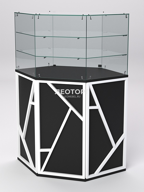 Угловой стол прилавок. В накопителе прилавка имеется распашная дверь с замком. Внутри имеется две полки. Столешница шестиугольной формы. Отличный вариант для хранения продукции. На столешнице можно размещать продукцию для демонстрации. В верхней части находится стеклянный купол с двумя полками, где удобно демонстрировать продукцию.