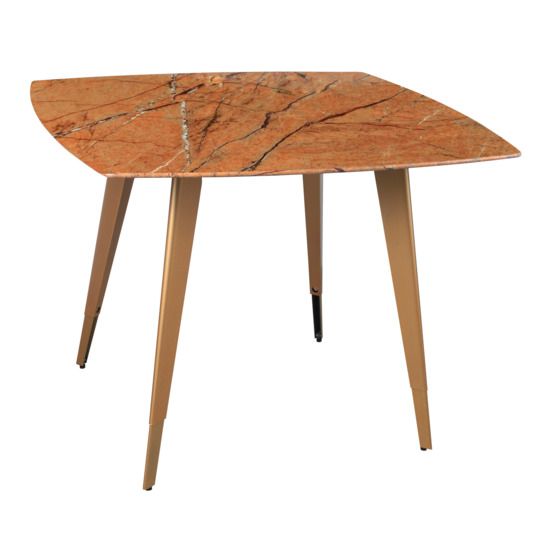 Обеденный стол с красивой стеклянной столешницей насыщенного цвета охры с рисунком под мрамор.