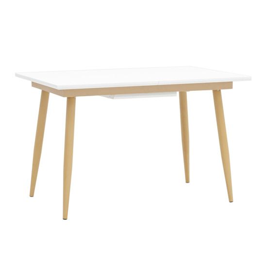 Обеденный стол в прямоугольной столешницей. Цвет столешницы белый. Ножки металлические, покрашены в цвет светлого дерева.