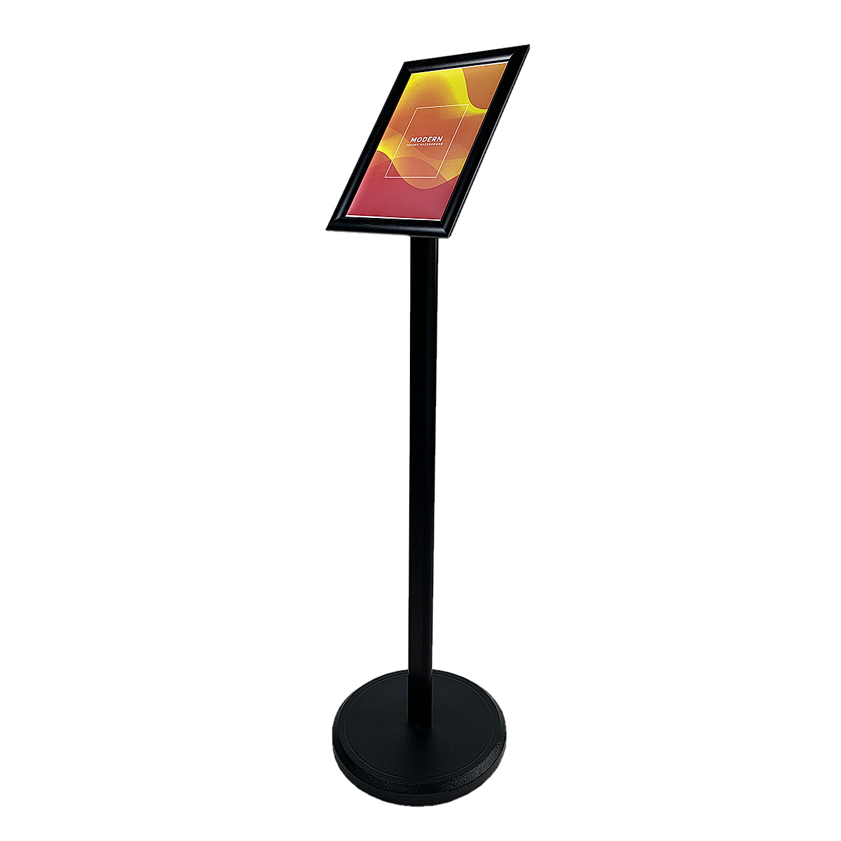 Рекламная напольная поворотная стойка ALUSNAP-STAND черного цвета предназначена для демонстрации информационной вставки формата A4.