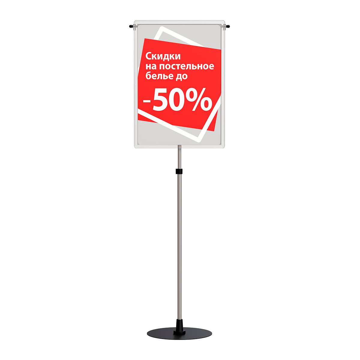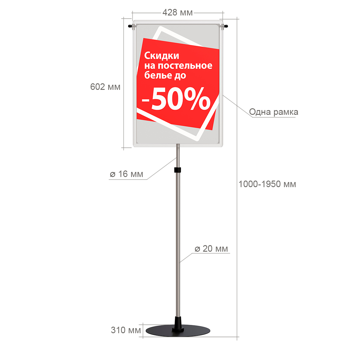 Рекламная стойка имеет устойчивое основание, а также регулируется по высоте с 1000 до 1950 мм за счет наличия телескопической трубки.