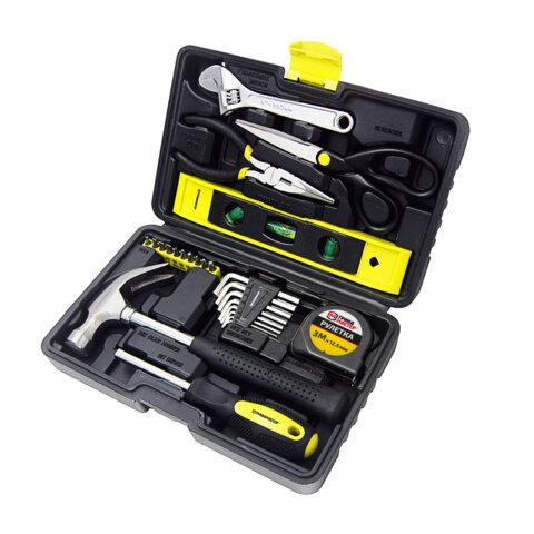 Столярно-слесарный набор ГРАНДМАСТЕР включает в себя необходимые инструменты для использования в быту. Состав набора позволит выполнить мелкий ремонт дома и на даче, а также пригодится для ремонта колесной и бытовой техники.Инструменты изготовлены из высококачественной углеродистой стали. Рукоятки инструментов выполнены из нескользящего пластика с резиновыми вставками — для максимального удобства и безопасности в работе. В состав набора входят инструменты, необходимые в столярно-слесарном деле, для ремонта колесной техники, бытовой техники, а также мебели. Весь инструмент располагается в ударопрочном кейсе с пластиковой застежкой. Для каждого предмета в наборе предусмотрено специальное углубление для удобства хранения. Состав набора: 1 ШТ. - МОЛОТОК-ГВОЗДОДЁР 1 ШТ. - ПЛОСКОГУБЦЫ-ДЛИННОГУБЦЫ 1 ШТ. - КЛЮЧ РАЗВОДНОЙ 8 ШТ. - КЛЮЧИ ШЕСТИГРАННЫЕ (1.5 - 6) 1 ШТ. - БИТОДЕРЖАТЕЛЬ 10 ШТ. - БИТЫ 1/4" 25ММ (SL: 3, 4, 5, 6; PH: 1, 2, 3; PZ: 1, 2, 3) 1 ШТ. - РУЛЕТКА 3М х 12,5мм 1 ШТ. - УРОВЕНЬ 1 ШТ. - НОЖНИЦЫ Упакован в цветной рукав, термоусадочную пленку и коричневый гофрокартон.