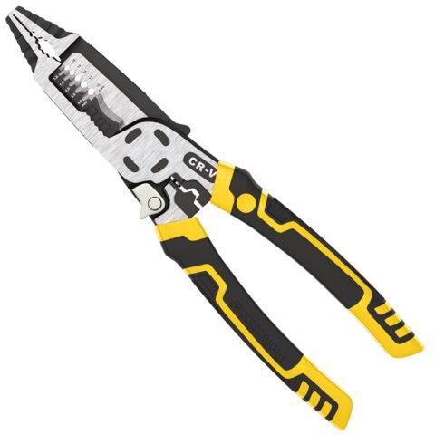 Многофункциональные плоскогубцы ГРАНДМАСТЕР – это надежный инструмент, необходимый каждому мастеру. Подходят как для профессионального монтажа, так и для бытовых задач.Плоскогубцы ГРАНДМАСТЕР изготовлены из профессиональной хромванадиевой стали CR-V, обладающей повышенной износостойкостью и прочностью. Твердость стали – 62 HRC по шкале Роквелла. Специальное покрытие ANTI-RUST защищает металл от коррозии. Эргономичные рукоятки из термопластичной резины обеспечивают удобный захват и предотвращают скольжение. Плоскогубцы оснащены: – фиксатором для хранения в закрытом положении; – энергосберегающей пружиной, снижающей усталость при работе. На торцах инструмента расположены насечки-надфили для удаления заусенцев. Острые режущие кромки предназначены для перекусывания кабеля. Дополнительные функции: – снятие изоляции с проводов диаметром 1, 1,5, 2, 2,5 и 4 мм; – надежный захват и фиксация предметов благодаря насечкам на губках; – намотка проволоки (имеется специальное круглое отверстие); – обжим различных видов клемм; – возможность забивания гвоздей благодаря высокой прочности стали. Упакованы в прозрачный блистер с европодвесом.