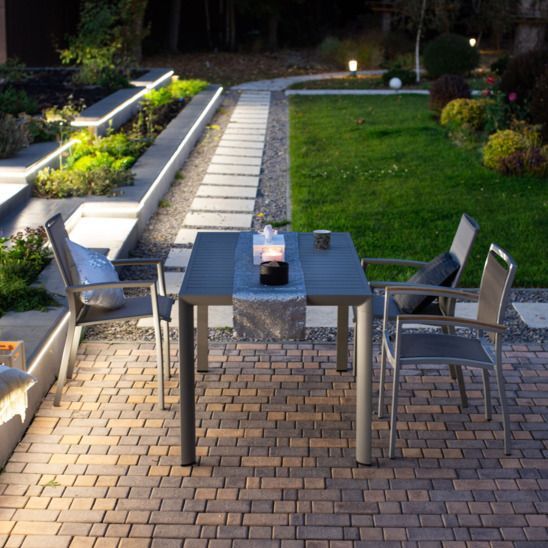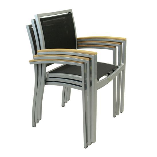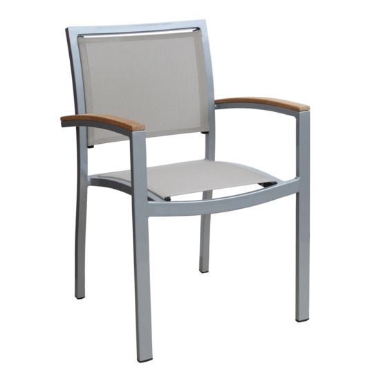 Современное садовое кресло из текстилена бежевого цвета. Высококачественная рама из нержавеющего алюминия с порошковым покрытием в серебре. Алюминиевые подлокотники с верхом из массива тика.
