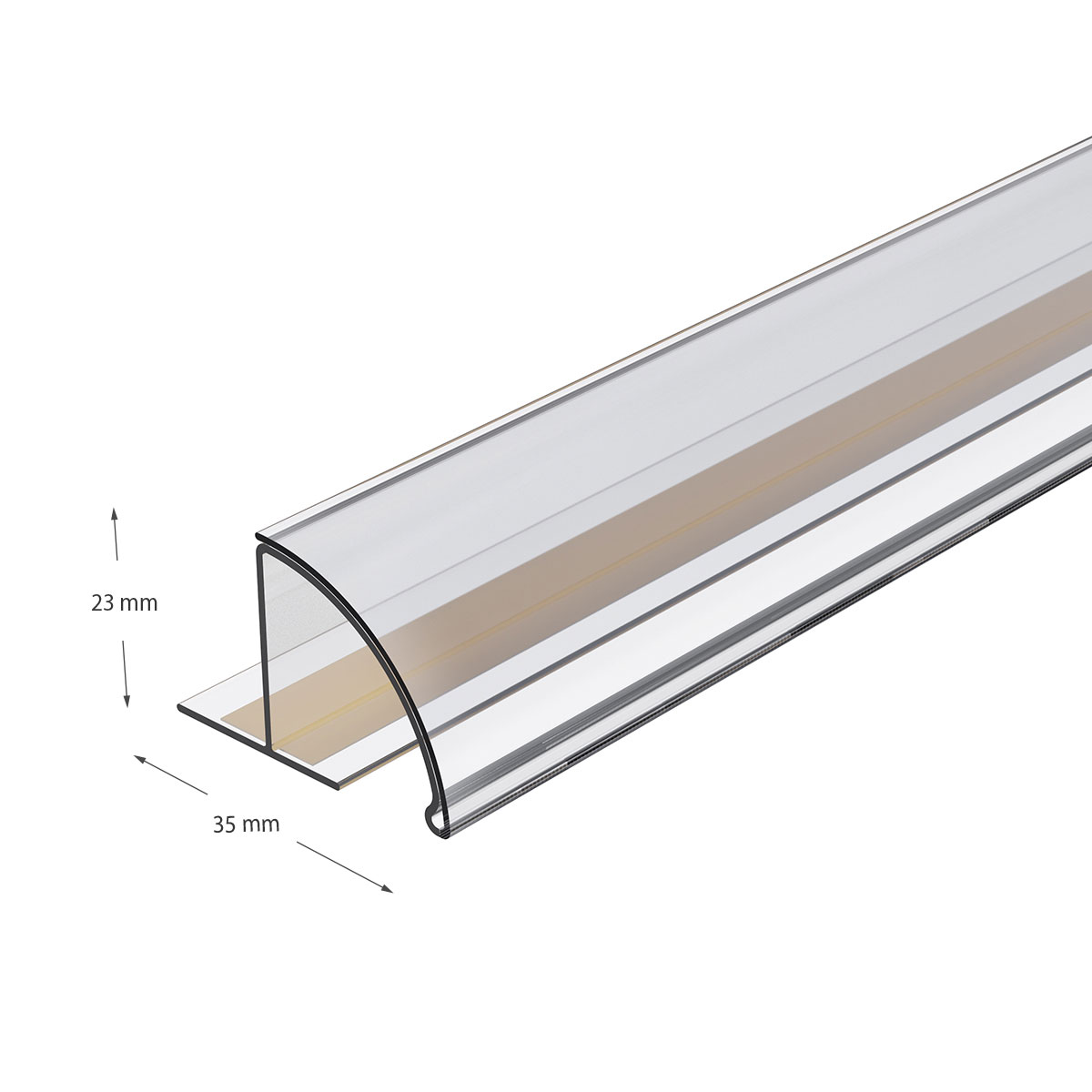 Используется как держатель для эффективного размещения рекламных вставок в зоне выкладки брендовых товаров или ценников, а также служит передним ограничителем для товара, предотвращая его падение с полки.