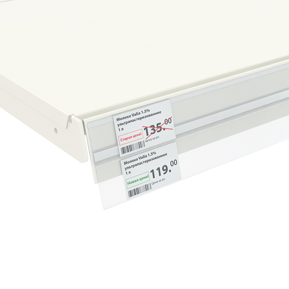 Прозрачный ценникодержатель DHH39 оснащен клейкой лентой, что позволяет применять его на любой гладкой и ровной поверхности. Устанавливается на переднюю торцевую часть стеллажных полок.