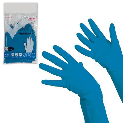Перчатки МНОГОРАЗОВЫЕ резиновые VILEDA многоцелевые, хлопчатобумажное напыление, ПРОЧНЫЕ, размер 8,5-9, L (большой), синие, вес 66 г, 174355