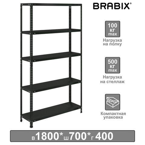 Металлический стеллаж BRABIX собирается с помощью болтов, за счет чего достигается устойчивая конструкция. Простой и экономичный способ организовать хранение вещей и различных грузов. Прекрасно дополняет интерьер в стиле "лофт" благодаря цвету "графит".Возможны два варианта сборки стеллажа. Высокий единый стеллаж (180 см) благодаря сборке стойки, или 2 невысоких (90 см) раздельных стеллажа. Стойка имеет разборную конструкцию, благодаря чему стеллаж поставляется в компактной упаковке. Максимальная нагрузка на полку при этом достигает 100 кг, на стеллаж - до 500 кг. Стойки с усиленным угловым профилем сложного сечения 30х30 мм и толщиной металла 1,2 мм. Полки имеют толщину основания 0,5 мм, усилены центральным ребром жесткости. Высота бокового и торцевого ребра полки - 33 мм, толщина - 1 мм. Для повышения жесткости всей конструкции верхняя и нижняя полка усилена дополнительными Г-образными уголками. Шаг установки полок - 25 мм. Опоры пластиковые, нерегулируемые. Вся необходимая фурнитура для сборки в комплекте.