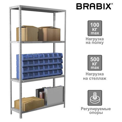 Металлический стеллаж BRABIX собирается с помощью болтов, за счет чего достигается устойчивая конструкция. Простой и экономичный способ организовать хранение вещей. Предназначены для хранения документов и различных грузов в офисе, на складе, в архиве.Стеллаж укомплектован регулируемыми опорами, которые позволяют нивелировать неровности пола. Максимальная нагрузка на полку достигает 100 кг, на стеллаж - до 500 кг. Стойки с усиленным угловым профилем сложного сечения 38х38 мм и толщиной металла 1,2 мм. Полки имеют толщину основания 0,5 мм, усилены центральным ребром жесткости. Высота бокового и торцевого ребра полки - 33 мм, толщина - 1 мм. Для повышения жесткости всей конструкции верхняя и нижняя полка усилена дополнительными Г-образными уголками. Шаг установки полок - 25 мм. Вся необходимая фурнитура для сборки в комплекте. Продукция марки Brabix выделяется лучшим соотношением цены и качества.