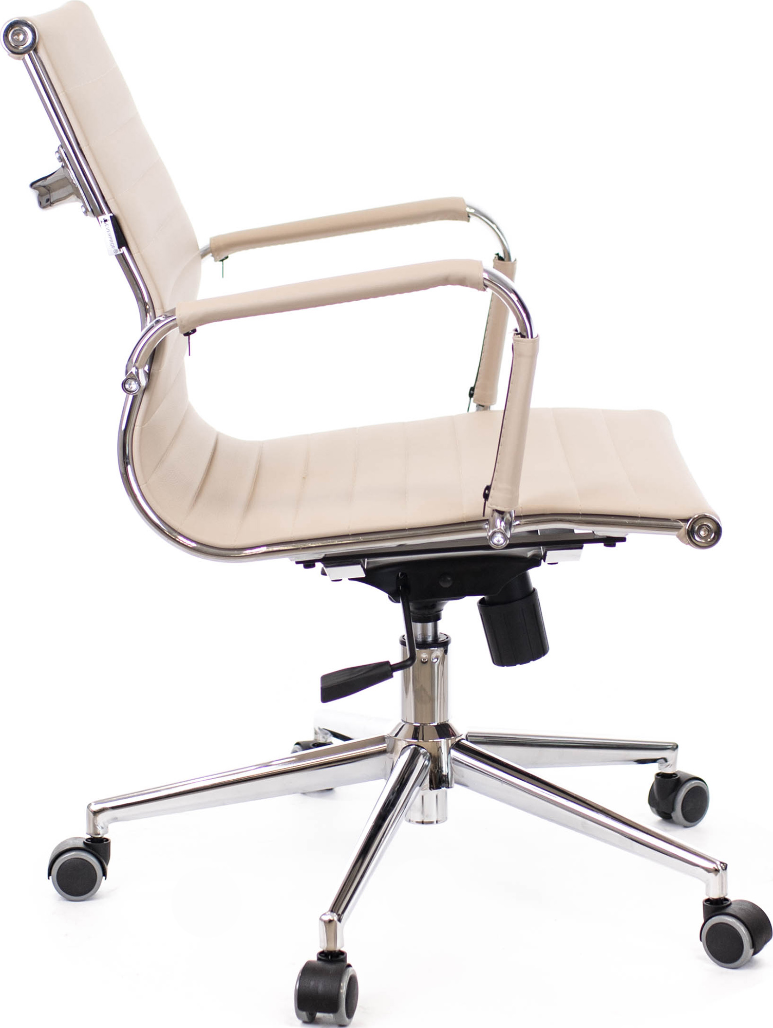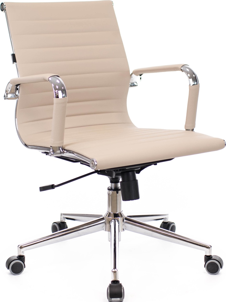 - Изысканный дизайн: Мягкая текстура бежевой экокожи в сочетании с блестящими хромированными подлокотниками добавляет креслу шика и утонченности.