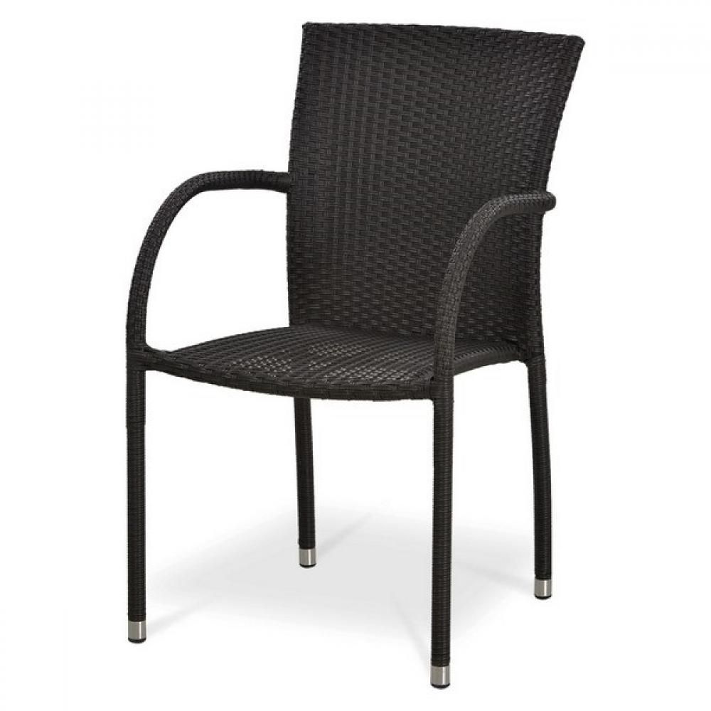 Стул выполнен на стальном каркасе с плетением из искусственного ротанга коричневого цвета. Имеет высокую спинку и подлокотники.