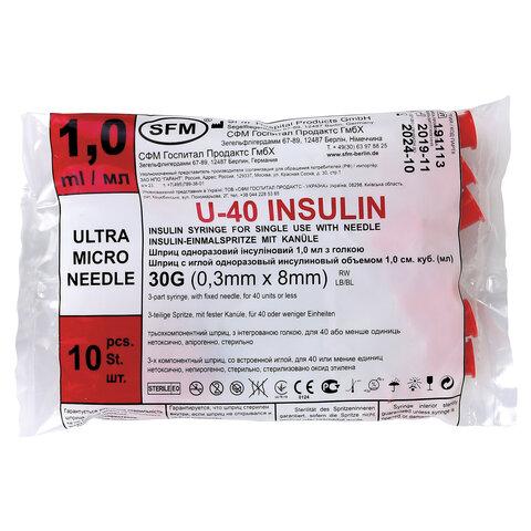 Шприц инсулиновый SFM, 1 мл, КОМПЛЕКТ 10 шт., в пакете, U-40 игла несъемная 0,3х8 мм - 30G, 534254