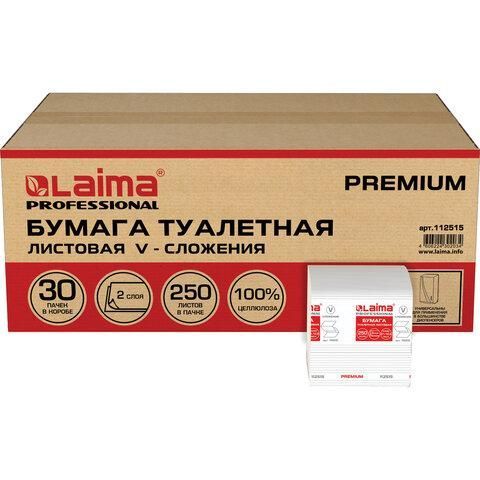 Бумага туалетная листовая 250шт, LAIMA (T3) PREMIUM, 2-сл, белая, 21х11см, КОМПЛЕКТ 30 пачек, 112515