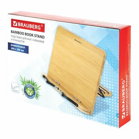Бамбуковая подставка для книг BRAUBERG - Ваш идеальный выбор для удобного расположения учебных материалов, книг, презентаций, а также гаджетов при чтении, просмотре видео. Незаменимый помощник дома и в офисе, идеально впишется в любой интерьер.Подставка BRAUBERG выполнена из экологичного материала - бамбука. Она способна удержать даже увесистые книги или гаджеты. Регулируемый наклон подставки позволяет комфортно разместить книгу, журнал или планшет на рабочем месте, обеспечивая удобство при чтении и работе с текстом, а также при просмотре видео. Держатели страниц, фиксирующие книгу снизу на выбранной странице, также оснащены насадками, которые защищают поверхность от царапин. Размер подставки - 28х20 см. Подставка упакована в картонную коробку со стильным дизайном и станет прекрасным презентом.