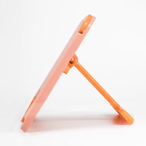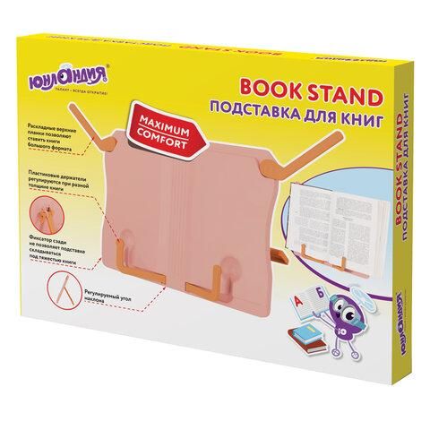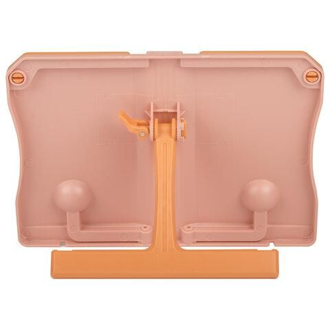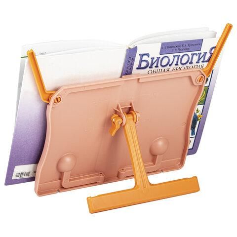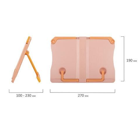 Подставка для книг и учебников ЮНЛАНДИЯ cтанет незаменимым помощником для школьников и любителей чтения. Использование подставки для книг способствует правильному формированию осанки.Изготовлена из прочного пластика. Регулируемый угол наклона обеспечивает удобство при работе с текстом, облегчает чтение и подготовку домашней работы. Раскладные верхние планки позволяют размещать книги большого формата. Нижние держатели регулируется в зависимости от толщины книги. Блокиратор позволяет надежно зафиксировать подставку на столе и не позволит ей упасть от тяжести книги. Размер подставки - 19х27 см. Цвет корпуса - розовый. Цвет держателей - оранжевый.