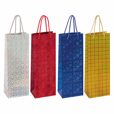 Бутылочный голографический пакет изготовлен из мелованной бумаги с веревочными ручками из полипропилена и представлен в четырех цветах и дизайнах. Выполнен в красном, синем, серебристом и золотистом цветах. Размер 13x8,5x36 см.