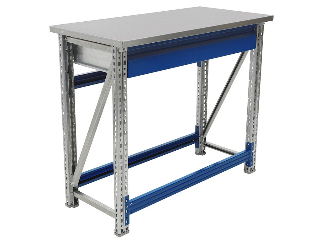 - Основные элементы верстака (опоры, полка, накладка на столешницу) изготовлены из оцинкованной стали, что позволяет устанавливать его в местах с повышенной влажностью.