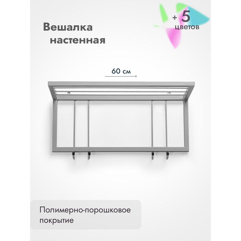 Вешалка настенная металлическая с полкой и крючками -60 (серый)