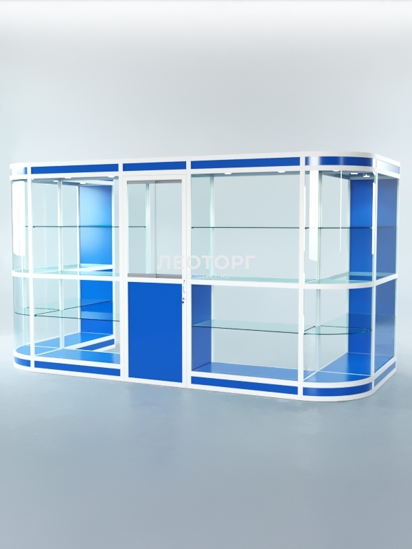 С внутренней стороны павильон полностью открытый, дверки отсутствуют в нижней и в верхней секциях. С фасадной стороны расположена входная дверь, в которой встроено окно выдачи и взаиморасчетов. Стеклянные раздвижные дверки окна выдачи закрываются на замок с внутренней стороны. Полка на уровне глухой части двери - откидная. Правая и левая стороны павильона представляют собой витрины, которые стыкуются к фасадной части секторными витринами.