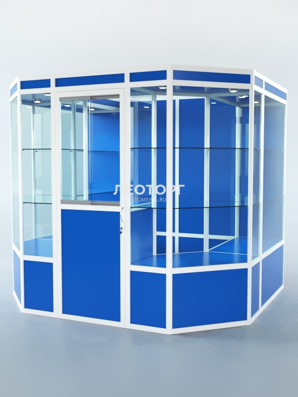С внутренней стороны павильон полностью открытый, дверки отсутствуют в нижней и в верхней секциях. С фасадной стороны расположена входная дверь между двумя шестигранными витринами, в которой встроено окно выдачи и взаиморасчетов. Стеклянные раздвижные дверки окна выдачи закрываются на замок с внутренней стороны. Полка на уровне глухой части двери - откидная. Правая и левая стороны павильона представляют собой витрины. Задняя стенка павильона из ДВП.