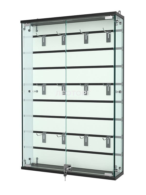 - особенность конструкции: отсутствие полок, экономпанель на задней стенке для крепления держателей, стеклянные боковые панели, распашные дверки с замком.