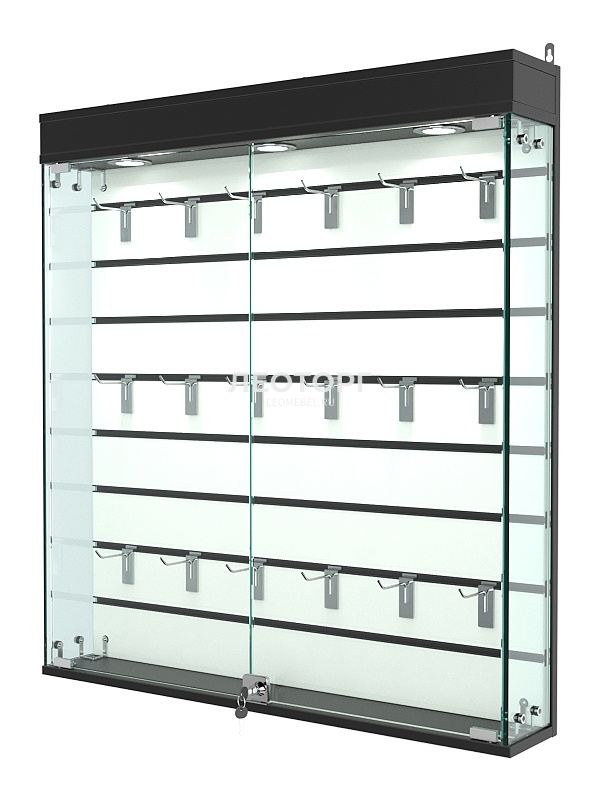 Ключевая особенность модели — наличие экономпанели на задней стенке, позволяющей с помощью крепежа размещать любой малогабаритный товар. Распашные дверки с замком обеспечивают надёжную защиту экспонатов. Верхняя подсветка (3 светильника) придаёт витрине выразительность и делает представленные предметы более заметными.