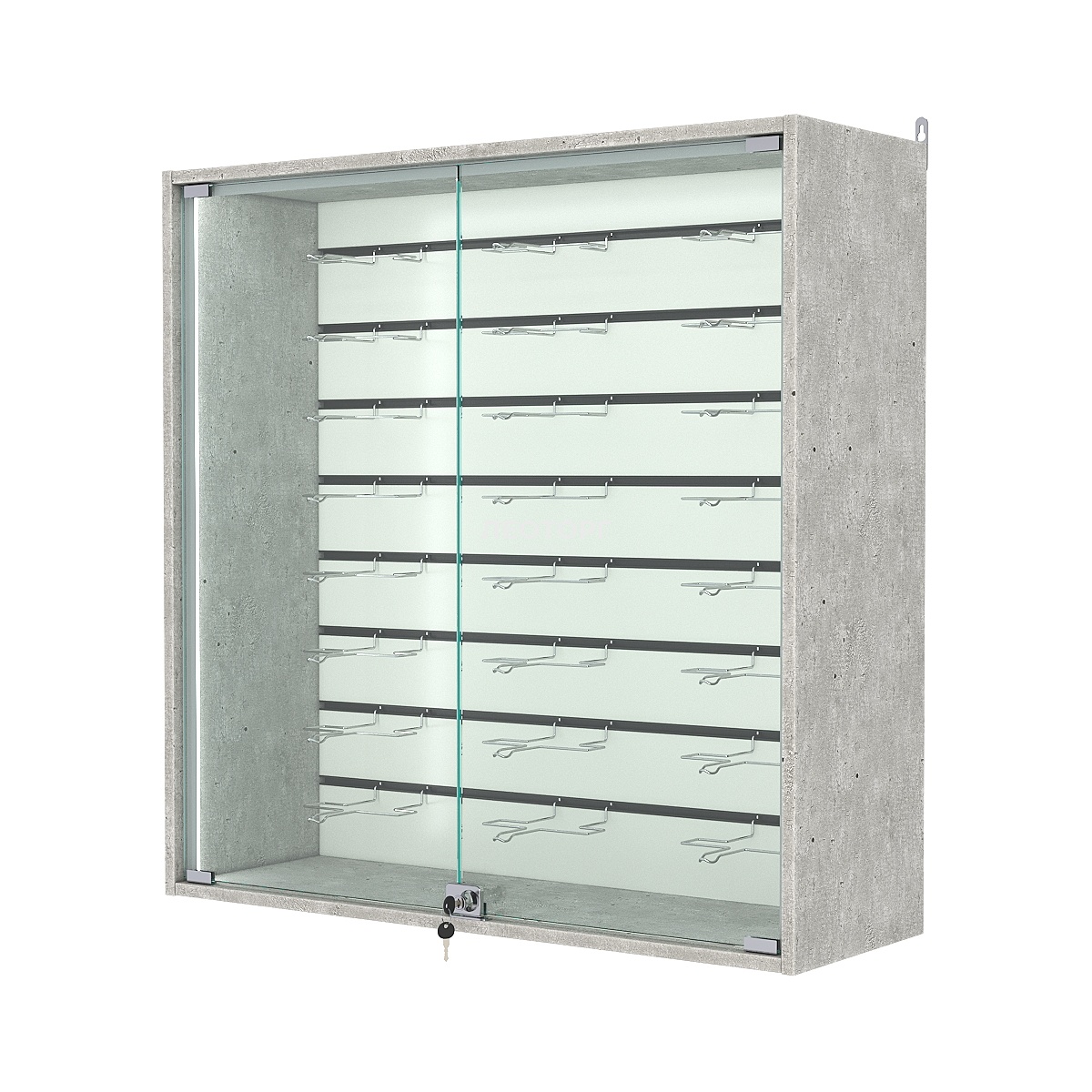 Эта подвесная шкаф-витрина создаёт организованную эстетичную среду для презентации товаров и экспонатов. Благодаря задней стенке из экономпанели, модель сочетает доступность и функциональность, эффективно выполняя роль как торгового оборудования, так и элемента интерьера. Мебельный щит с прорезями позволяет использовать различные крючки и кронштейны, которые также можно приобрести в нашем магазине.