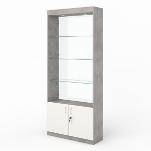 В нижней части витрины имеется тумба - накопитель для хранения товаров, которые не выставлены на витрине. Тумба - накопитель помогает экономить пространство и делает ее более функциональной.
