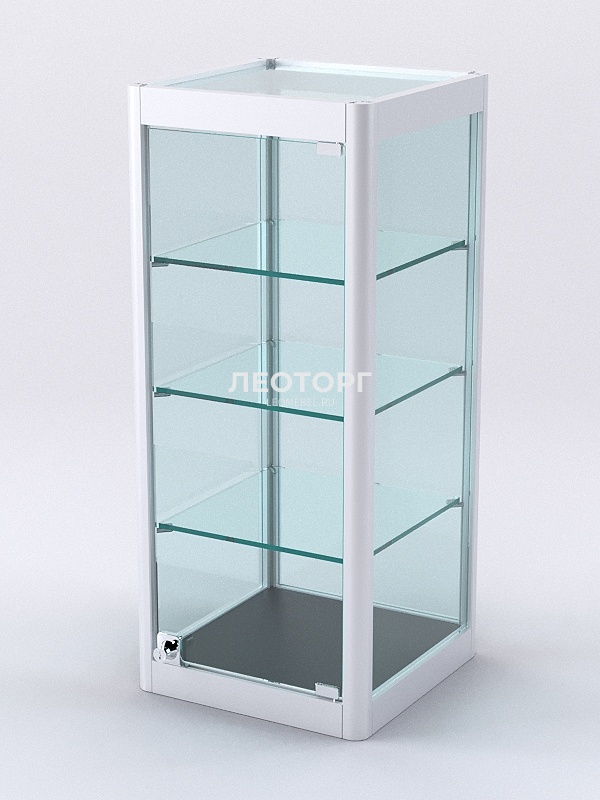 Витрина имеет металлический каркас, выполненный из алюминиевого профиля. Внутри располагаются три полки. Спереди находится распашная дверка с замком. Корпус и полки витрины - стеклянные, задняя стенка изготовлена из Стекла.