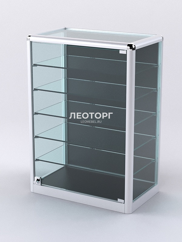 Витрина имеет металлический каркас, выполненный из алюминиевого профиля. Внутри располагаются пять полок. Спереди находится распашная дверка с замком. Корпус и полки витрины - стеклянные, задняя стенка изготовлена из ДСП.